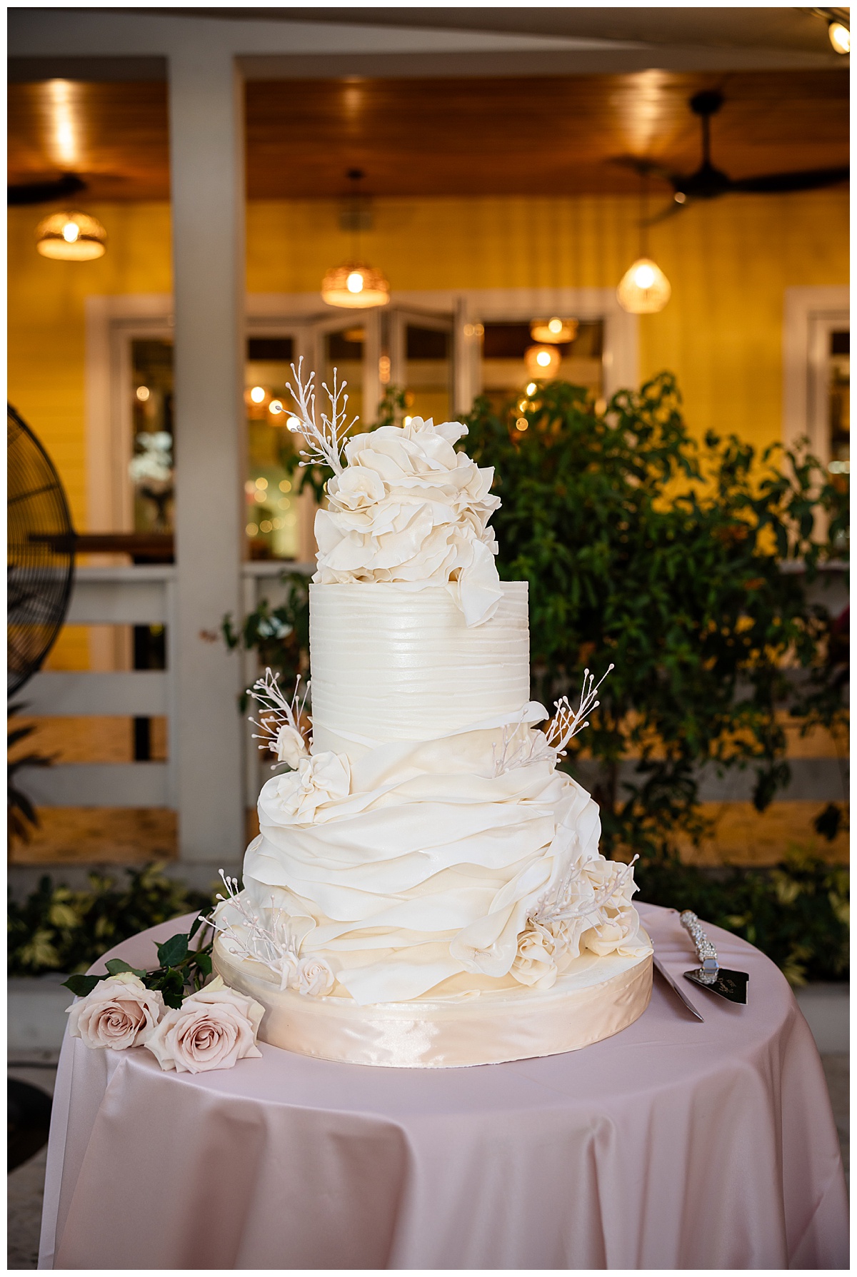 The venue was lit to perfection with warm bistro lights strung throughout the property, creating a magical atmosphere. We thoughtfully designed the layout with a mix of round, banquet, and serpentine tables with a dance floor perfectly placed next to the DJ booth and a fun photo booth experience by @partyboothcayman.