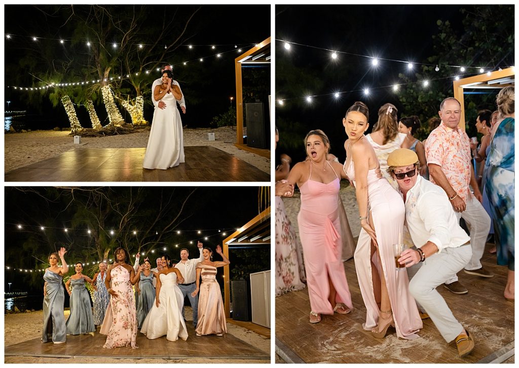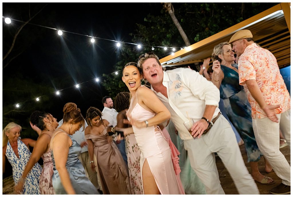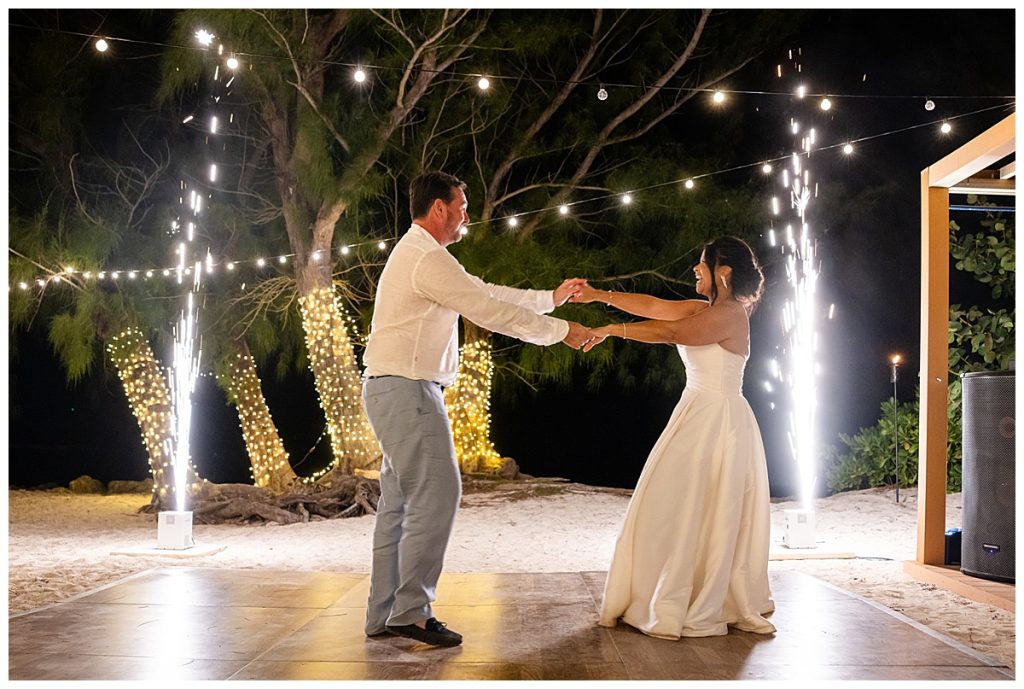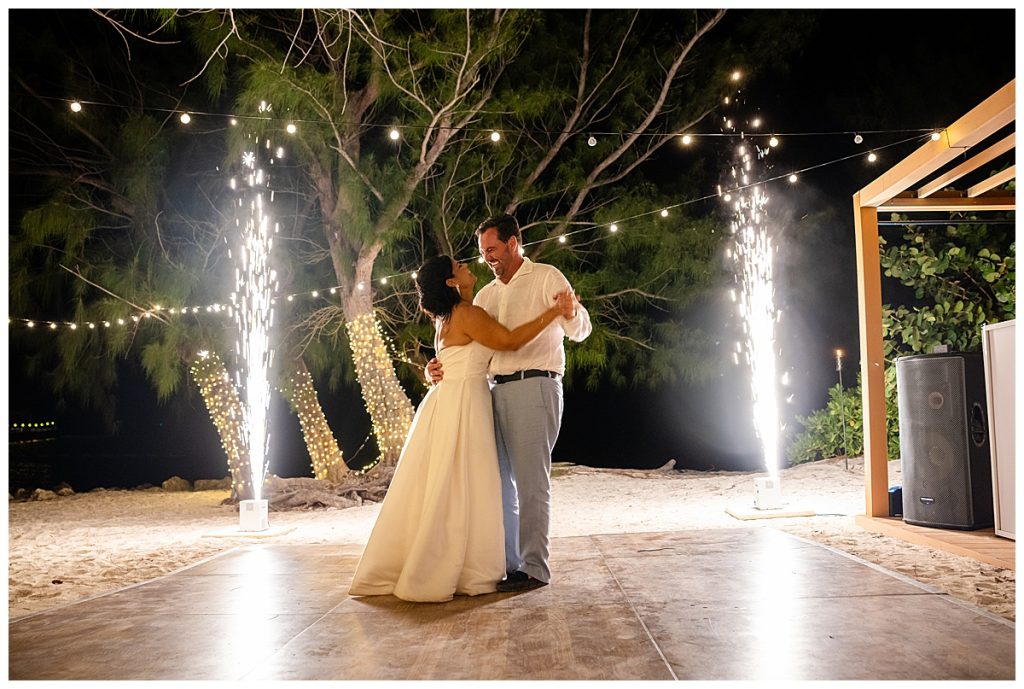 Rum Point Wedding of Dallas and Katherine dancing under the stars with cold fireworks